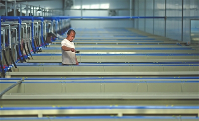河鲀魚(yú)智能化孵化車(chē)間,工人在觀察魚(yú)苗的進(jìn)食情況,判斷標(biāo)準(zhǔn)是看魚(yú)肚子是否鼓起來(lái)。
