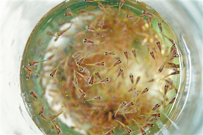 在工作人員的指點(diǎn)下,記者在池壁附近看到了一群剛孵化出來(lái)一周和兩周的河鲀魚(yú)苗。這些剛孵出的魚(yú)苗也被稱(chēng)為“黑芝麻”或者“水花”。