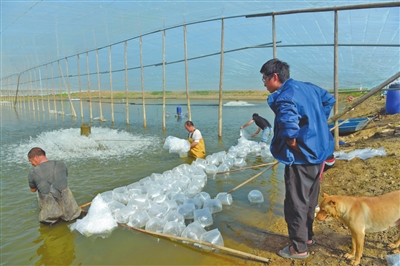養(yǎng)殖基地工人在冬棚里放養(yǎng)河鲀魚(yú)魚(yú)苗。