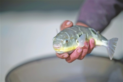 工人捕撈一些成年河鲀魚(yú)進(jìn)行生長(zhǎng)健康觀察檢查。