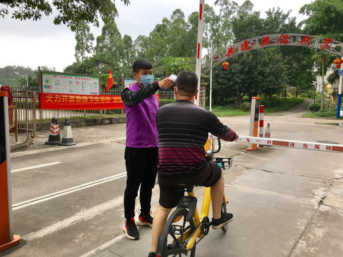 退役在校大學生何波堅守疫情防控一線 被評為五桂山十佳志愿服務明星  何波在小區(qū)門崗測量體溫。