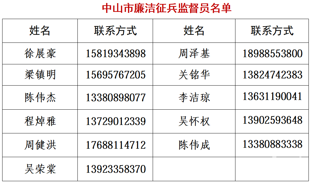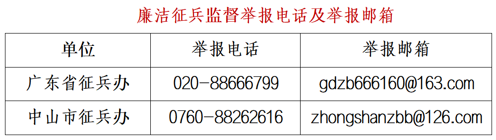 為嚴(yán)明兵員征集紀(jì)律,筑牢廉潔征兵底線,進(jìn)一步提升征兵工作透明度,中山市征兵辦將2026年我市廉潔征兵監(jiān)督員名單及監(jiān)督舉報(bào)電話、郵箱予以公布。廣大市民若發(fā)現(xiàn)征兵違法違紀(jì)線索或廉潔征兵問題,可向廉潔征兵監(jiān)督員反映舉報(bào),也可直接撥打省、市監(jiān)督舉報(bào)電話,或發(fā)送郵件至指定信箱反饋。