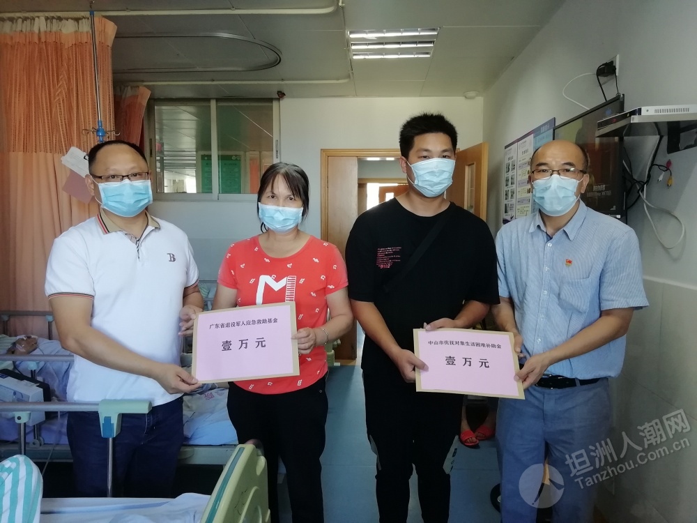 近日,中山市首個應(yīng)急救助資金申請已通過省退役軍人事務(wù)廳審核,坦洲籍退役軍人郭叔獲得了應(yīng)急救助資金1萬元。該筆應(yīng)急救助資金于日前由省退役軍人事務(wù)廳按照規(guī)定程序撥付到申請人個人賬戶。 6月18日,中山市、坦洲鎮(zhèn)兩級退役軍人服務(wù)中心及坦洲社會事務(wù)局相關(guān)負(fù)責(zé)人一行到坦洲醫(yī)院對郭叔進(jìn)行慰問,告知他申請的應(yīng)急救助資金已由省退役軍人事務(wù)廳撥付到賬,叮囑他要聽從醫(yī)生的囑咐,積極配合康復(fù)治療,樹立起戰(zhàn)勝疾病的勇氣和信心。郭叔家人特地制作了一面錦旗送到中山市退役軍人服務(wù)中心主任張波手中,由衷表達(dá)了對市、鎮(zhèn)、村各級退役軍人服務(wù)中心(站)的感激之情。