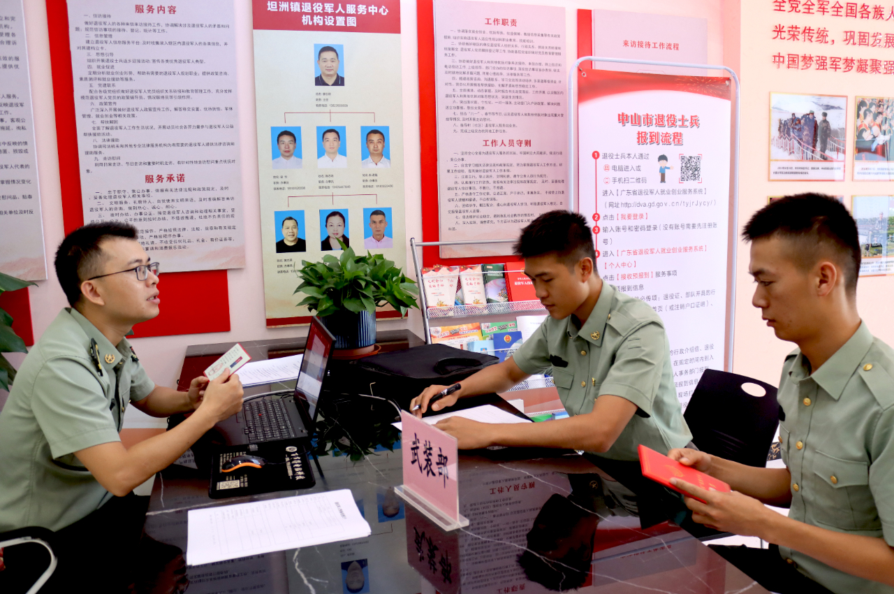 退役士兵返鄉(xiāng)前夕,坦洲鎮(zhèn)退役軍人服務(wù)中心就提前建立坦洲鎮(zhèn)2021年秋季退役士兵報(bào)到微信群,退役士兵加群后可查閱相關(guān)政策及業(yè)務(wù)事項(xiàng)、通知及信息,有疑問提出的話工作人員在群內(nèi)第一時(shí)間回復(fù)和解答問題。為簡(jiǎn)化報(bào)到流程、提高效率,讓退役士兵少跑路,坦洲鎮(zhèn)公共服務(wù)辦公室積極謀劃,與人民武裝部聯(lián)合辦公,派出工作人員進(jìn)駐鎮(zhèn)退役軍人服務(wù)中心辦理預(yù)備役登記手續(xù)并做好相關(guān)政策宣傳及解釋工作。預(yù)備役登記手續(xù)辦結(jié)后,由退役軍人服務(wù)中心依次辦理報(bào)到登記、信息采集、組織關(guān)系轉(zhuǎn)接,并在政務(wù)服務(wù)大廳設(shè)立專窗辦理醫(yī)、社保接續(xù),在公安分局設(shè)立專窗辦理戶口落戶、換領(lǐng)身份證等服務(wù)保障項(xiàng)目。讓退役士兵享受方便快捷的報(bào)到服務(wù),體會(huì)“家”的溫馨。