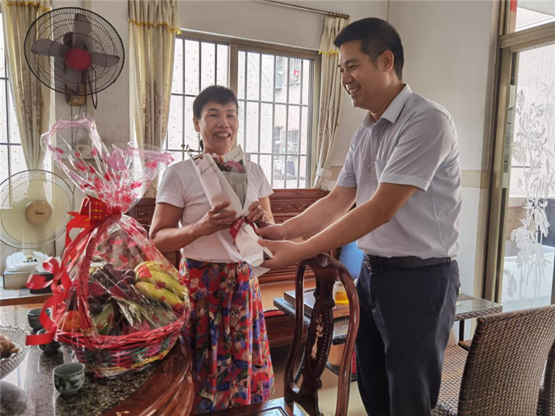 每到一戶,南頭鎮(zhèn)退役軍人服務(wù)中心主任黃國全都為“兵媽媽”獻上鮮花和果籃,并了解邊防海防現(xiàn)役軍人在部隊的服役情況,以及家屬身體狀況、生活、工作等情況,對她們默默支持孩子為國防建設(shè)作貢獻致以崇高的敬意。
