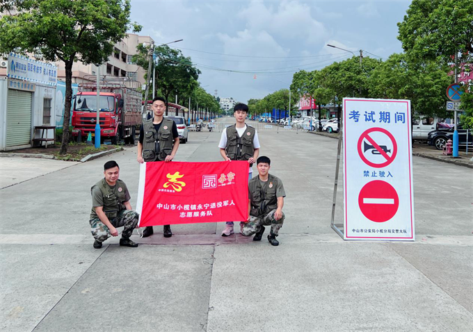 沙溪鎮(zhèn)退役軍人志愿者和民兵協(xié)助公安交警開(kāi)展高考護(hù)航工作。 7日早上7時(shí)許,在沙溪鎮(zhèn)寶珠東路龍山中學(xué)路口,多名退役軍人紅旗志愿服務(wù)隊(duì)隊(duì)員和民兵協(xié)助公安交警在路口設(shè)立警戒線,做好交通疏導(dǎo)、公共秩序維護(hù)、卡點(diǎn)值守等服務(wù),同時(shí)為考生及家長(zhǎng)提供礦泉水、應(yīng)急救援等服務(wù),給考生營(yíng)造一個(gè)安全、寧?kù)o、有序、文明的考試環(huán)境。 在中山市桂山中學(xué)門口,三鄉(xiāng)鎮(zhèn)退役軍人志愿者和民兵按照事先分工安排,分散在各個(gè)交通路口,有的拉警戒線,有的指揮車輛通行,有的疏散人群,有的負(fù)責(zé)在助力點(diǎn)發(fā)放礦泉水,他們精神抖擻,干勁十足,積極協(xié)助公安民警,做好考場(chǎng)周邊交通秩序維護(hù),確保考試期間考場(chǎng)周邊環(huán)境安靜有序。