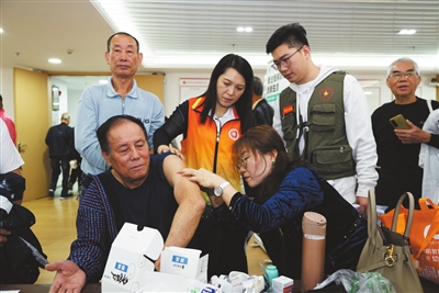 工作人員、志愿者協(xié)助退役軍人測(cè)血糖。本報(bào)記者 黃藝杰 攝