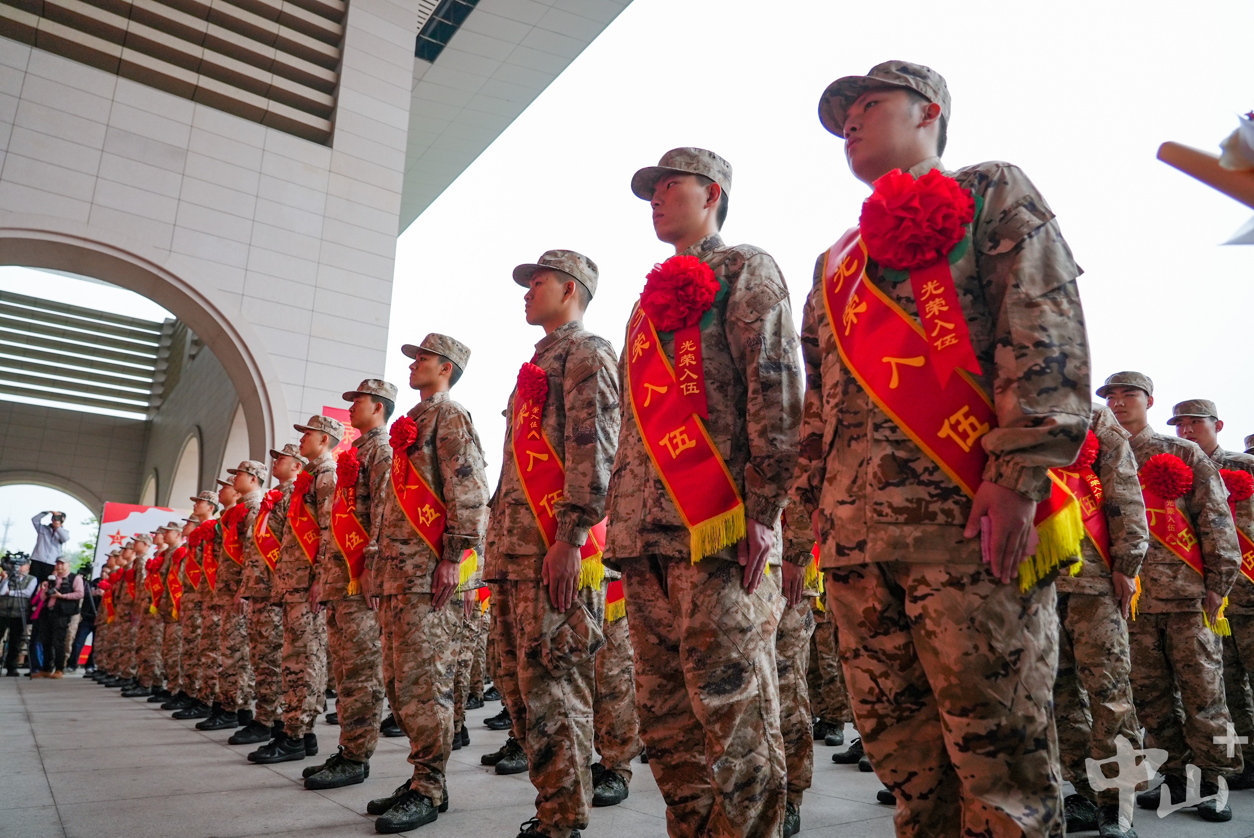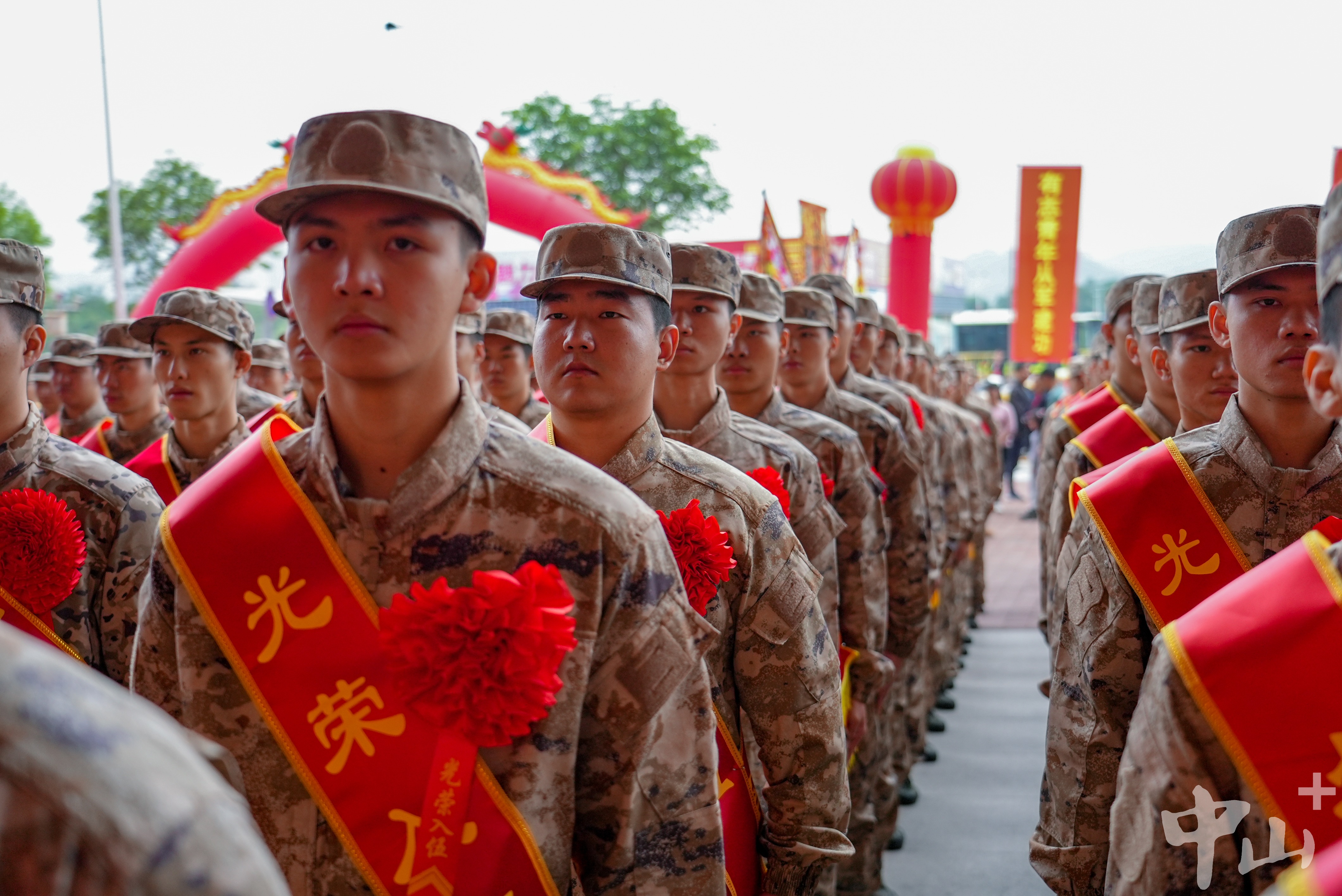 歡送現(xiàn)場,新兵們?nèi)盅b整肅,身披“光榮入伍”的紅色綬帶,胸戴紅花,精神抖擻、軍姿挺拔。