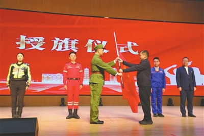 “戎耀香山”老兵宣講工作室負責人李克在中山市“理響興中”宣講團授旗儀式上接旗。(資料圖片)