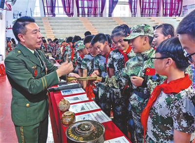 林東小學師生興致勃勃參觀移動軍旅展覽館紅色收藏品。