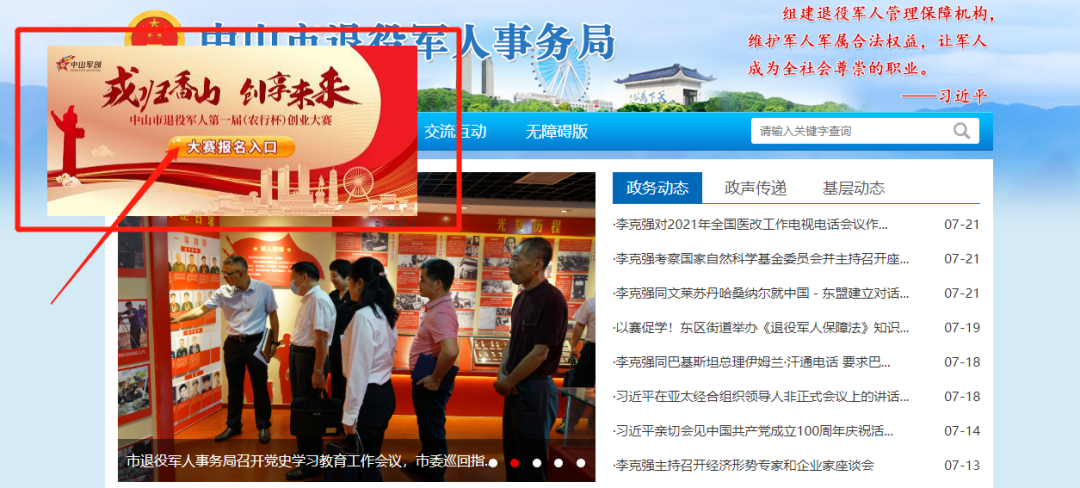 由中山市退役軍人事務(wù)局、中山市人力資源和社會(huì)保障局共同舉辦,主題為“戎歸香山 創(chuàng)享未來(lái)”的中山市退役軍人第一屆(農(nóng)行杯)創(chuàng)業(yè)大賽正在火熱報(bào)名中。為幫助廣大退役軍人更高效、準(zhǔn)確地報(bào)名參加大賽,制作了以下指引,希望對(duì)廣大參賽者有所幫助。 中山市退役軍人第一屆(農(nóng)行杯)創(chuàng)業(yè)大賽報(bào)名方式有以下三種: 一、官方網(wǎng)站報(bào)名 二、微信公眾號(hào)報(bào)名 三、郵箱報(bào)名 官方網(wǎng)站報(bào)名 01 登錄大賽官方網(wǎng)站 在瀏覽器輸入網(wǎng)址:http://tyjr.zs.gov.cn/,點(diǎn)擊飄窗【大賽報(bào)名入口】進(jìn)入用戶登錄界面。如圖1所示: