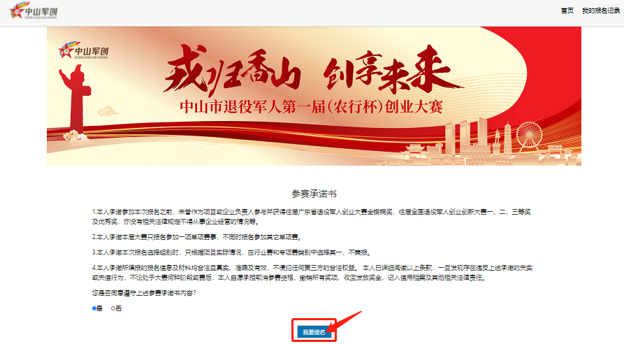 圖6 04 同意參賽承諾書 點(diǎn)擊首頁(yè),跳轉(zhuǎn)至“參賽承諾書”界面。仔細(xì)閱讀參賽承諾書,確認(rèn)同意后點(diǎn)擊【我要報(bào)名】按鈕。如圖7-8所示: