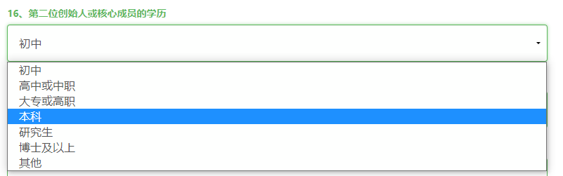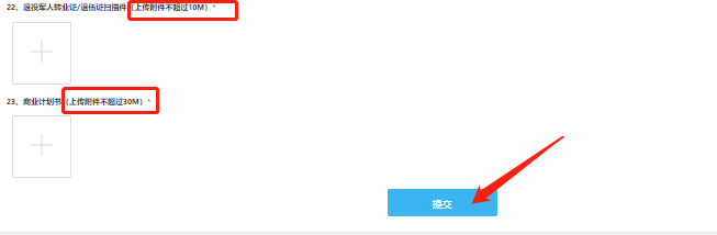 圖10 07 填寫報(bào)名表 學(xué)歷一欄系統(tǒng)默認(rèn)為“初中”,如需修改,點(diǎn)擊可跳出其他內(nèi)容選項(xiàng),按實(shí)際情況選擇即可。注意根據(jù)內(nèi)容提示填寫相應(yīng)正確信息,有“*”標(biāo)志的為必填內(nèi)容,注意退役軍人轉(zhuǎn)業(yè)證/退伍證掃描件上傳附件不得超過10M,商業(yè)計(jì)劃書上傳附件不得超過30M。報(bào)名表所有項(xiàng)目?jī)?nèi)容格式須完全填寫正確才可成功上傳。如圖11-12所示: