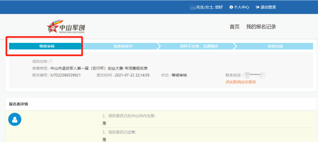 圖12 參賽用戶完成注冊(cè)后,點(diǎn)擊【提交】按鈕,即可報(bào)名成功,提交狀態(tài)顯示為“等待審核”。如圖13-14所示:
