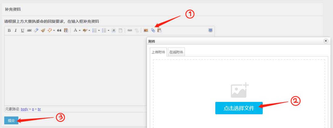 圖14 08 補(bǔ)充資料提交 若想對(duì)已提交的報(bào)名信息進(jìn)行補(bǔ)充,可在登陸首頁(yè)點(diǎn)擊“我的報(bào)名記錄”,點(diǎn)擊【查看詳情】進(jìn)入報(bào)名表詳情頁(yè)面,拉至頁(yè)面底部的補(bǔ)充資料欄,點(diǎn)擊回形針圖標(biāo)添加補(bǔ)充文件,再點(diǎn)擊提交即可。如圖15-16所示: