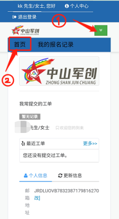 圖23 登錄成功后可跳轉(zhuǎn)至“個(gè)人中心”,點(diǎn)擊右上角綠色圖標(biāo)可展開菜單欄,點(diǎn)擊【首頁(yè)】即可進(jìn)入“參賽承諾書”確認(rèn)界面開始填寫報(bào)名列表。如圖24所示: 報(bào)名列表填寫詳細(xì)操作可參考報(bào)名方式一“官方網(wǎng)站報(bào)名”步驟4-8指引。