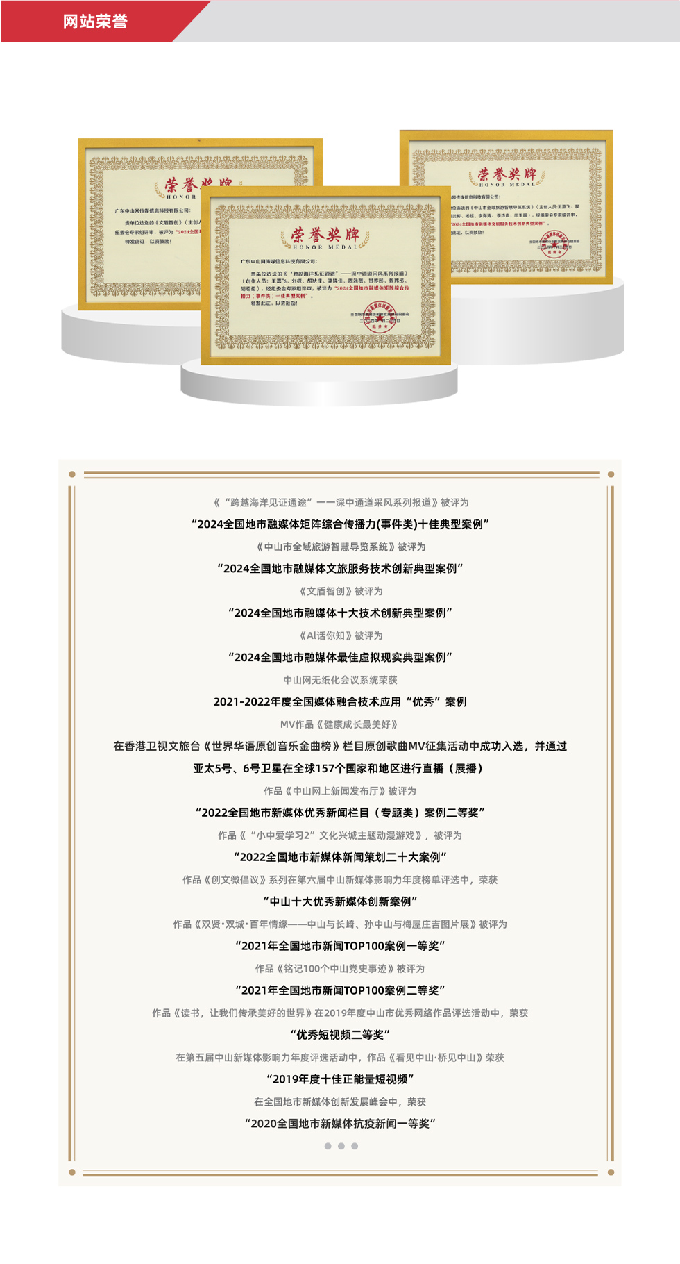 為積極響應(yīng)國家文化體制改革,2012年中山網(wǎng)信科應(yīng)運(yùn)而生,是中山日報(bào)社全資一級企業(yè)。經(jīng)過十多年的發(fā)展,中山網(wǎng)信科已成長為國家高新技術(shù)企業(yè)、廣東省專精特新中小企業(yè),擁有互聯(lián)網(wǎng)新聞信息服務(wù)許可證、信息網(wǎng)絡(luò)傳播視聽節(jié)目許可證、增值電信業(yè)務(wù)經(jīng)營許可證等國家、省、市級行業(yè)許可,是本地證照最為齊全的新聞機(jī)構(gòu)之一。