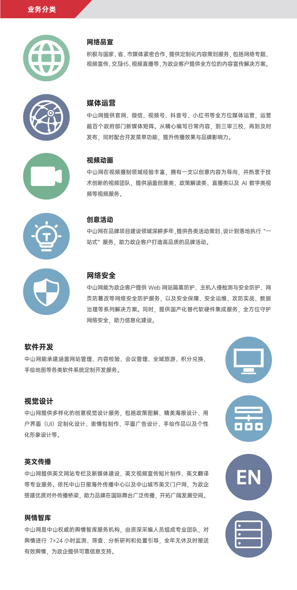 廣東中山網(wǎng)傳媒信息科技有限公司(簡稱中山網(wǎng)信科)是一家以本地新聞門戶網(wǎng)站——中山網(wǎng)為平臺,以新聞資訊、視頻動畫、媒體運(yùn)營、輿情智庫、網(wǎng)站建設(shè)及運(yùn)維服務(wù)和網(wǎng)絡(luò)安全技術(shù)服務(wù)為主營業(yè)務(wù)的互聯(lián)網(wǎng)綜合信息及技術(shù)服務(wù)運(yùn)營商。