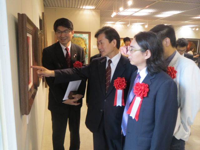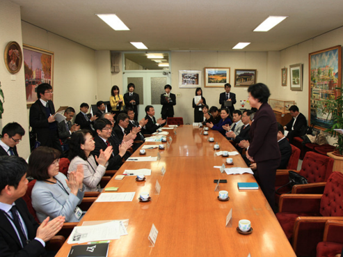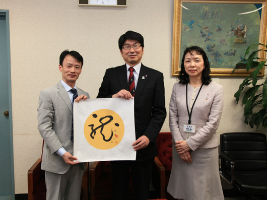 中山市教育考察團成員向田上市長、馬場教育委員長展示中山市小學生作品