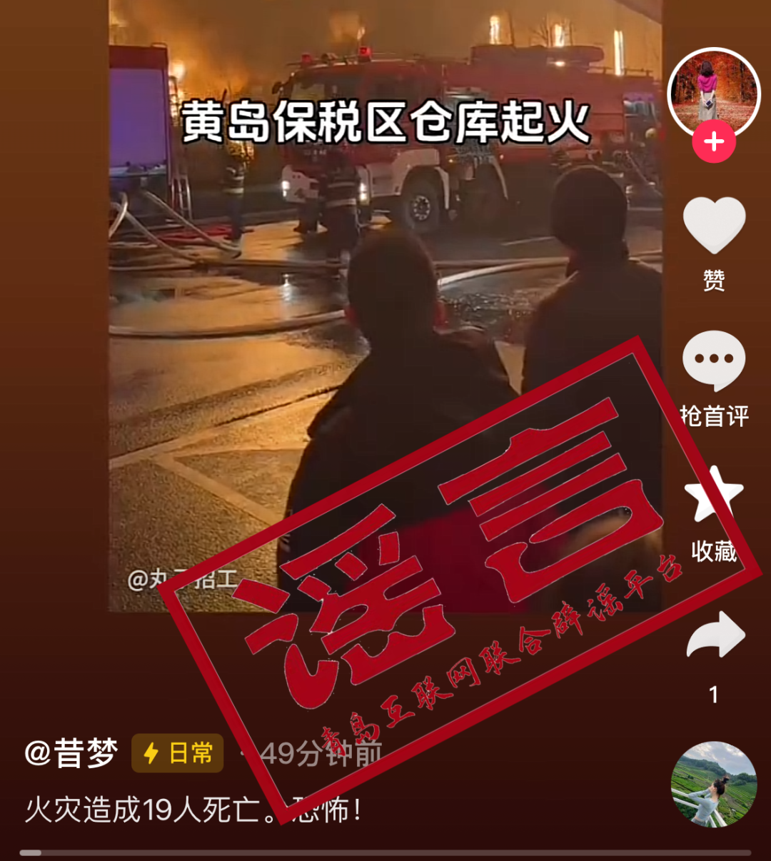 有網(wǎng)民在社交平臺發(fā)布青島火災相關視頻,并配以“火災造成19人死亡”“恐怖”等文字,此系謠言!