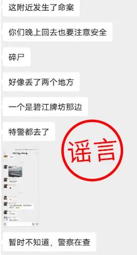 4月22日上午,網(wǎng)民莫某(男,28歲)在其小區(qū)業(yè)主群發(fā)布消息,稱“最近幾天碧江附近發(fā)生了命案”。隨后,該謠言被陳某(女,38歲)刷到,在未驗證真實情況下,陳某將謠言轉(zhuǎn)發(fā)到聊天群,并發(fā)表“北滘發(fā)生碎尸案”等不實言論。最終導(dǎo)致多名網(wǎng)友在未經(jīng)證實的情況下,轉(zhuǎn)發(fā)謠言到多個微信群內(nèi),造成較惡劣的社會影響。