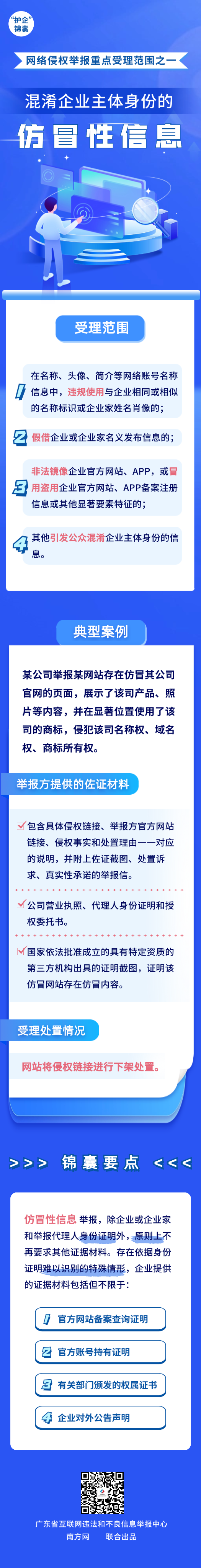 為有效助力企業(yè)維護自身網(wǎng)絡(luò)合法權(quán)益,廣東省互聯(lián)網(wǎng)違法和不良信息舉報中心精心準備了“護企”錦囊,結(jié)合案例帶大家了解涉企網(wǎng)絡(luò)侵權(quán)信息的重點受理范圍,今天推出重點受理范圍之一——混淆企業(yè)主體身份的仿冒性信息。