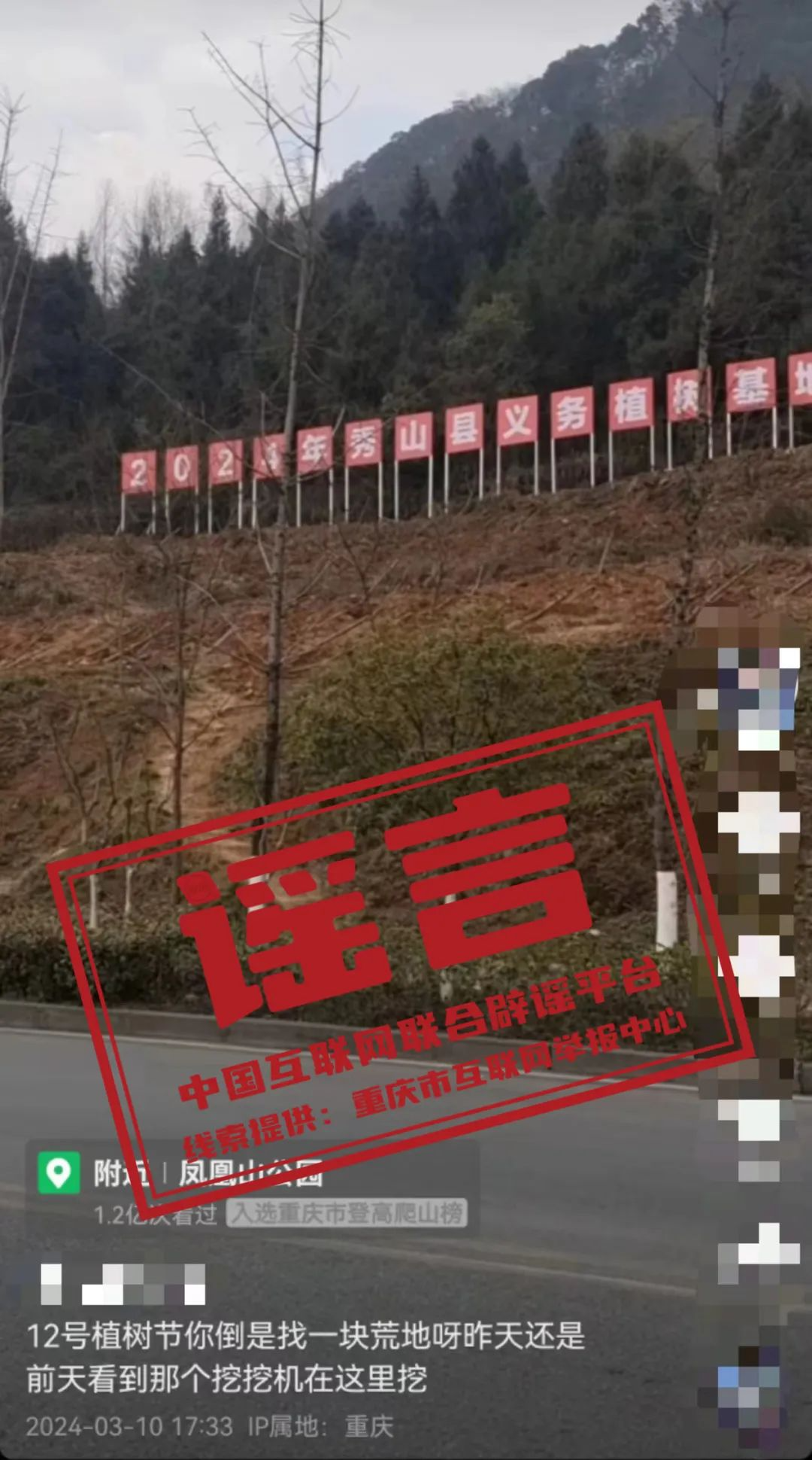 謠 言 重慶市秀山縣鳳凰山公園把原有樹(shù)木挖了來(lái)辦植樹(shù)節(jié)?