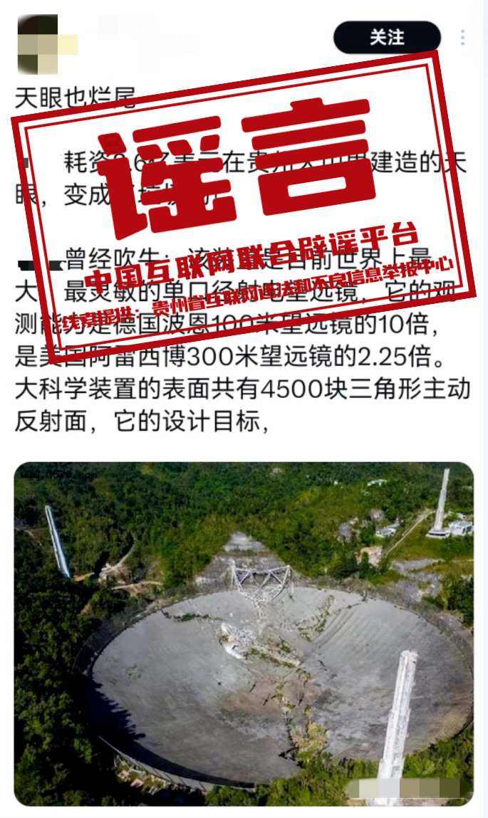 真相:近日,海外社交平臺有網(wǎng)民發(fā)布一張圖片,聲稱“耗資2.6億美元在貴州大山里建造的天眼,變成了垃圾場!”對此,“貴州辟謠”官方微信公眾號發(fā)布消息稱,網(wǎng)傳說法為謠傳,網(wǎng)傳圖片實為美國波多黎各的阿雷西博天文臺(Arecibo Observatory)于2020年12月發(fā)生徹底坍塌的畫面,該天文臺主要的觀測裝置為阿雷西博射電望遠鏡。事實上,這并非“中國天眼”第一次“被坍塌”,2020年阿雷西博望遠鏡第一次出現(xiàn)嚴重損壞之際,網(wǎng)絡(luò)中就曾出現(xiàn)過類似謠言。