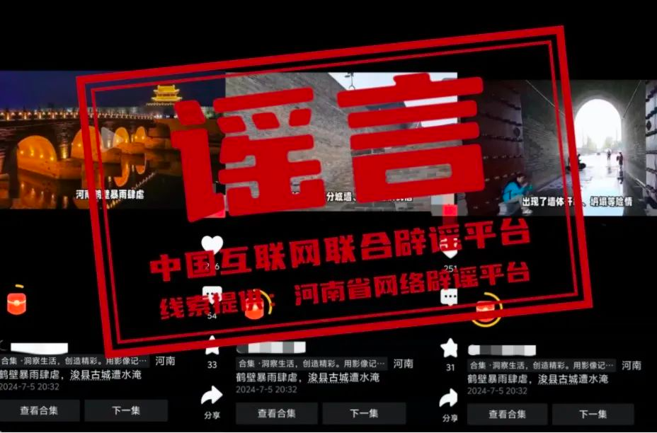 真相:近日,有網(wǎng)民在網(wǎng)絡(luò)平臺發(fā)布內(nèi)容為“河南鶴壁暴雨肆虐,浚縣古城遭水淹”的視頻信息,引發(fā)社會關(guān)注。經(jīng)核實(shí),7月5日浚縣出現(xiàn)暴雨天氣,強(qiáng)降雨期間浚縣古城北大街、東城門廣場等處出現(xiàn)積水情況,經(jīng)過積極排澇,雨停后路面積水很快被排空,恢復(fù)正常通行,不存在視頻中所說的“古城風(fēng)貌受損嚴(yán)重”“古城內(nèi)的部分城墻、古街巷出現(xiàn)不同程度的損毀”“古城墻出現(xiàn)了墻體開裂、坍塌等險(xiǎn)情”“古城內(nèi)的博物館、紀(jì)念館等文化設(shè)施也遭受不同程度的損失”等現(xiàn)象。該視頻多為當(dāng)?shù)嘏f聞及外地視頻嫁接拼湊。目前,??h古城秩序正常。(來源:河南省網(wǎng)絡(luò)辟謠平臺、??h古城保護(hù)建設(shè)服務(wù)中心)