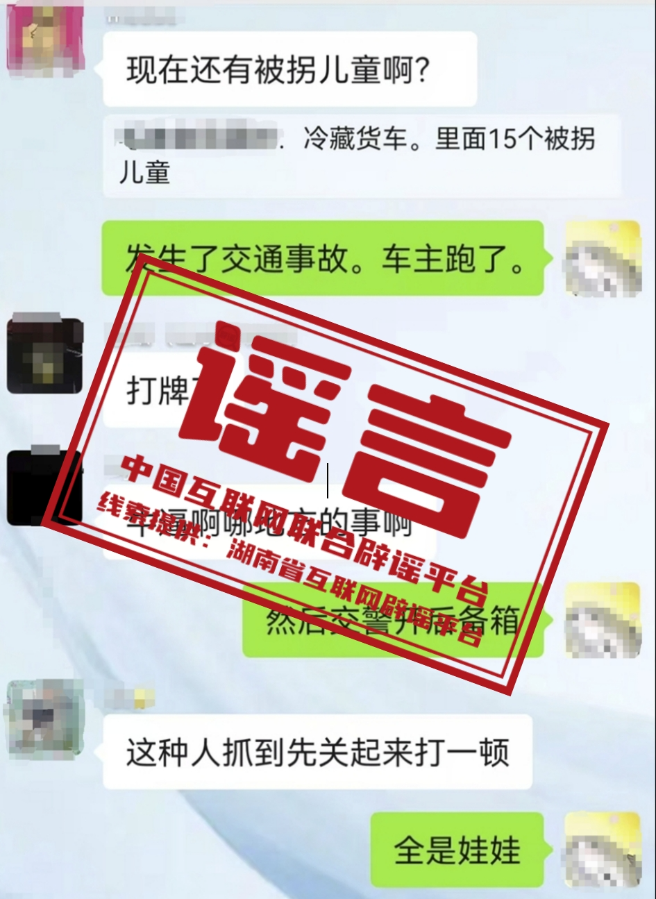 真相:9月4日,一則“湖南一冷藏車發(fā)生交通事故,交警在車上發(fā)現(xiàn)15名被拐兒童”的消息在網(wǎng)絡(luò)社交平臺傳播,引發(fā)網(wǎng)民關(guān)注。5日,湖南省湘潭市公安局雨湖分局發(fā)布警情通報(bào),“經(jīng)公安機(jī)關(guān)查證,該信息系謠言”。目前,虛構(gòu)事實(shí)擾亂公共秩序的違法行為人朱某已被公安機(jī)關(guān)依法行政拘留。(來源:“湖南省互聯(lián)網(wǎng)舉報(bào)中心”微信公眾號、“雨湖公安”微信公眾號)